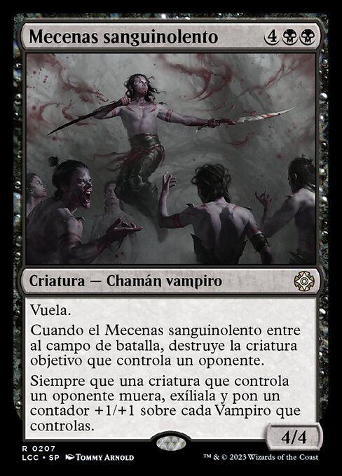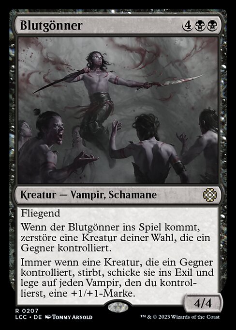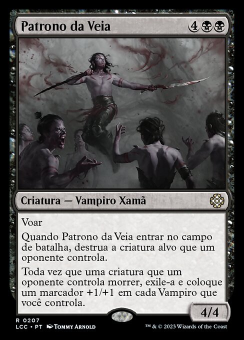 ![]() Variations— Parts— | Patron of the Vein4 / 4 Flying When this creature enters, destroy target creature an opponent controls. Whenever a creature an opponent controls dies, exile it and put a +1/+1 counter on each Vampire you control.
