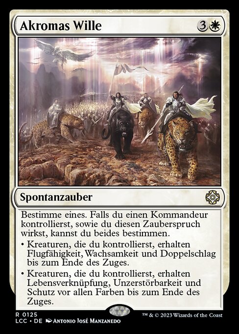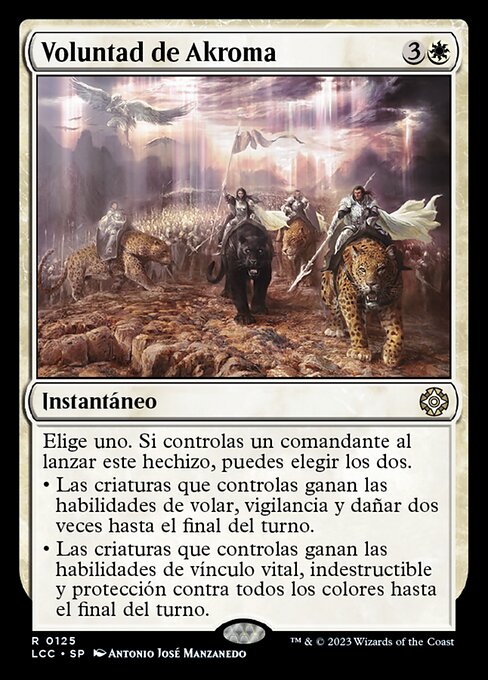 ![]() Variations— Parts— | Volonté d'AkromaChoisissez l'un. Si vous contrôlez un commandant au moment où vous lancez ce sort, vous pouvez choisir les deux. • Les créatures que vous contrôlez acquièrent le vol, la vigilance et la double initiative jusqu'à la fin du tour. • Les créatures que vous contrôlez acquièrent le lien de vie, l'indestructible et la protection contre toutes les couleurs jusqu'à la fin du tour.