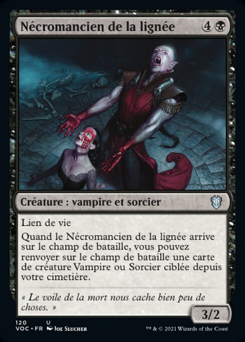 ![]() Variations— Parts— | Nécromancien de la lignée3 / 2 Lien de vie Quand le Nécromancien de la lignée arrive sur le champ de bataille, vous pouvez renvoyer sur le champ de bataille une carte de créature Vampire ou Sorcier ciblée depuis votre cimetière.