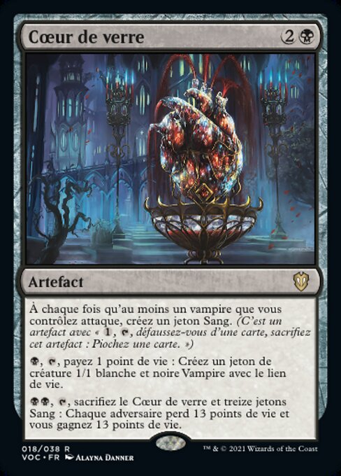 ![]() Variations— Parts— | Cœur de verreÀ chaque fois qu'au moins un vampire que vous contrôlez attaque, créez un jeton Sang. (C'est un artefact avec «