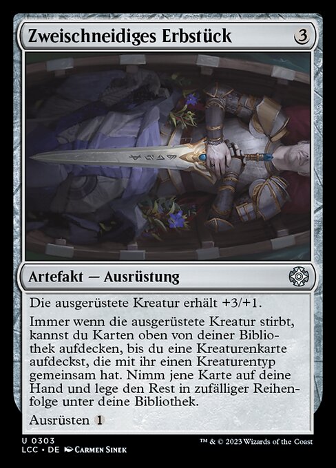 |  Variations— Parts— | Cimelio AffilatoLa creatura equipaggiata prende +3/+1. Ogniqualvolta la creatura equipaggiata muore, puoi rivelare carte dalla cima del tuo grimorio finché non riveli una carta creatura che condivide un tipo di creatura con essa. Aggiungi quella carta alla tua mano e metti le altre in fondo al tuo grimorio in ordine casuale. Equipaggiare