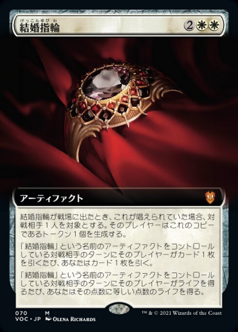 ![]() Variations— Parts—  | 結婚指輪結婚指輪が戦場に出たとき、これが唱えられていた場合、対戦相手1人を対象とする。そのプレイヤーはこれのコピーであるトークン1つを生成する。 「結婚指輪」という名前のアーティファクトをコントロールしている対戦相手のターンにそのプレイヤーがカード1枚を引くたび、あなたはカード1枚を引く。 「結婚指輪」という名前のアーティファクトをコントロールしている対戦相手のターンにそのプレイヤーがライフを得るたび、あなたはその点数に等しい点数のライフを得る。