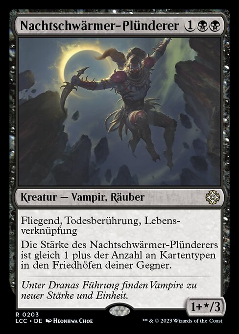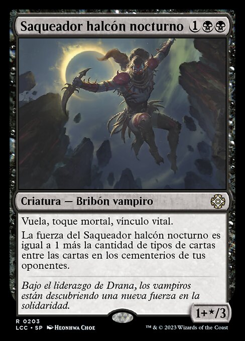 ![]() Variations— Parts— | Necrófago Falcão da Noite1+* / 3 Voar, toque mortífero, vínculo com a vida O poder de Necrófago Falcão da Noite é igual a 1 mais o número de tipos de card entre os cards nos cemitérios de seus oponentes.