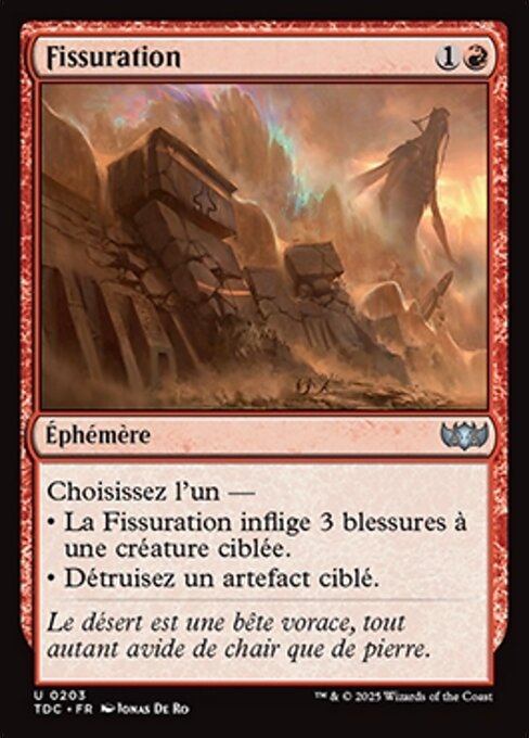 |  Variations— Parts— | FissurationChoisissez l'un — • La Fissuration inflige 3 blessures à une créature ciblée. • Détruisez un artefact ciblé.