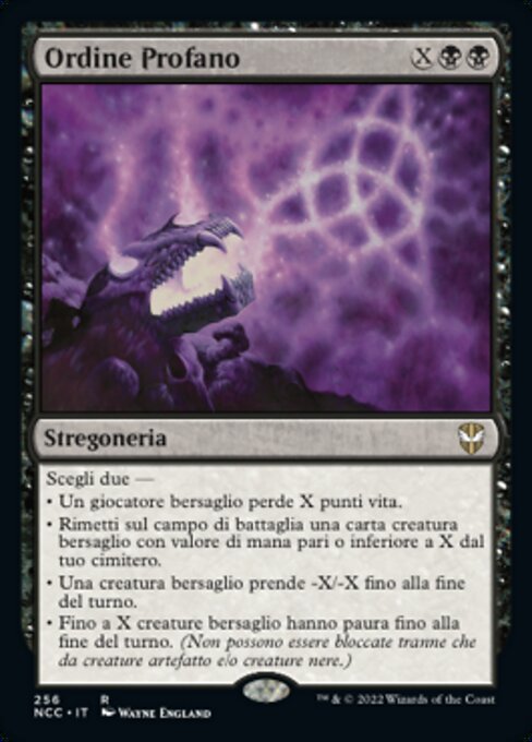 |  Variations— Parts— | Ordine ProfanoScegli due Un giocatore bersaglio perde X punti vita; oppure rimetti in gioco una carta creatura bersaglio con costo di mana convertito pari o inferiore a X dal tuo cimitero; oppure una creatura bersaglio prende -X/-X fino alla fine del turno; oppure fino a X creature bersaglio hanno paura fino alla fine del turno.