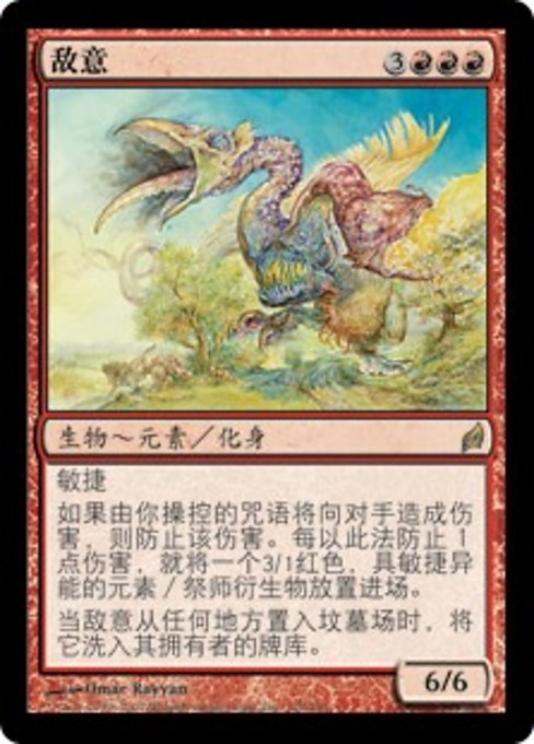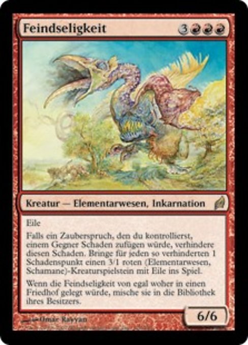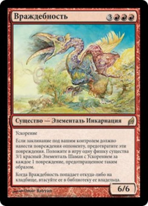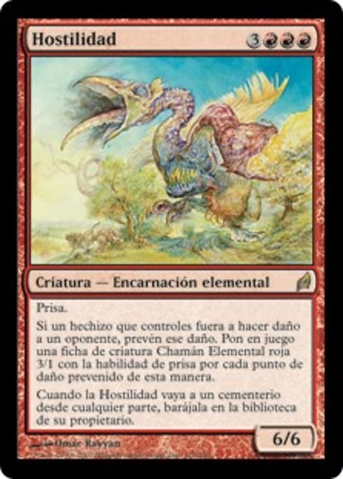 ![]() Variations— Parts— | Ostilità6 / 6 Rapidità Se una magia che controlli sta per infliggere danno a un avversario, previeni quel danno. Metti in gioco una pedina creatura Sciamano Elementale 3/1 rossa con rapidità per ogni punto danno prevenuto in questo modo. Quando l'Ostilità viene messa in un cimitero da qualsiasi zona, rimescolala nel grimorio del suo proprietario.