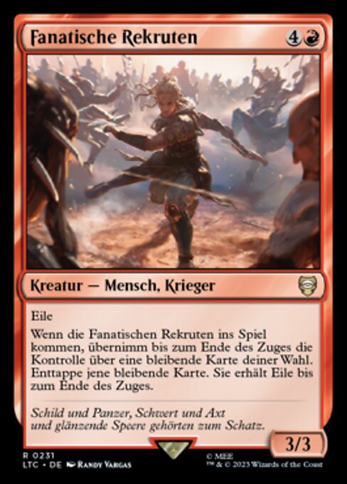 |  Variations— Parts— | Reclute Zelanti3 / 3 Rapidità Quando le Reclute Zelanti entrano nel campo di battaglia, prendi il controllo di un permanente bersaglio fino alla fine del turno. STAPpa quel permanente. Ha rapidità fino alla fine del turno.