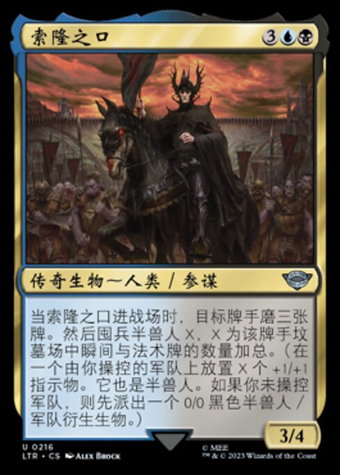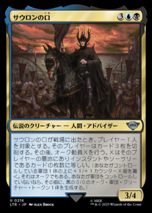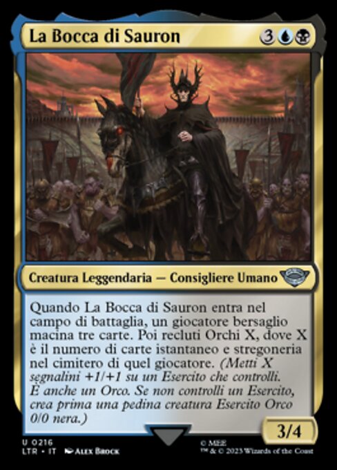 ![]() Variations : 1Parts : 2 | The Mouth of Sauron3 / 4 When The Mouth of Sauron enters, target player mills three cards. Then amass Orcs X, where X is the number of instant and sorcery cards in that player's graveyard. (Put X +1/+1 counters on an Army you control. It's also an Orc. If you don't control an Army, create a 0/0 black Orc Army creature token first.)