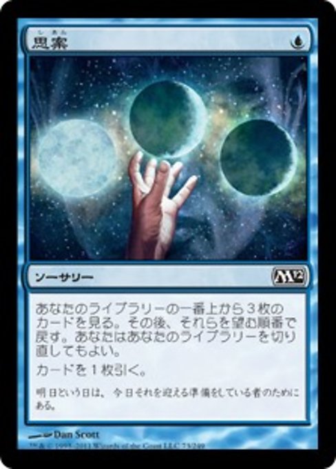 |  Variations— Parts— | 思案あなたのライブラリーの一番上から3枚のカードを見る。その後、それらを望む順番で戻す。 あなたはあなたのライブラリーを切り直してもよい。 カードを1枚引く。