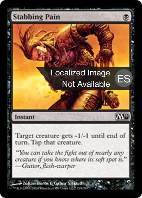 LegalitiesLegal Duel Penny Predh Legacy Modern Pauper Vintage Commander Oathbreaker Paupercommander Not Legal Brawl Future Alchemy Pioneer Historic Standard Timeless Gladiator Oldschool Premodern Standardbrawl RulingsIf Stabbing Pain targets an untapped creature with 1 toughness, that creature gets -1/-1, then it becomes tapped, then (after Stabbing Pain resolves) it’s put into the graveyard as a state-based action. Similarly, if Stabbing Pain targets an untapped creature with 1 less than lethal damage marked on it (such as a 3/3 creature with 2 damage marked on it), that creature gets -1/-1, then it becomes tapped, then (after Stabbing Pain resolves) it’s destroyed as a state-based action. In each case, any abilities that trigger when that creature becomes tapped will trigger.