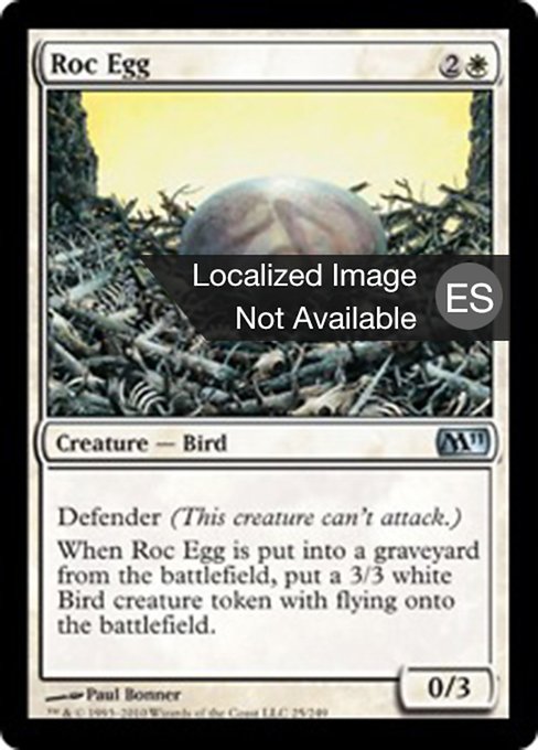 ![]() Variations— Parts— | Uovo di Roc0 / 3 Difensore (Questa creatura non può attaccare.) Quando l'Uovo di Roc viene messo in un cimitero dal campo di battaglia, metti sul campo di battaglia una pedina creatura Uccello 3/3 bianca con volare.
