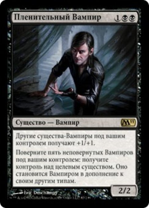 ![]() Variations— Parts— | Vampiro Seducente2 / 2 Le altre creature Vampiro che controlli prendono +1/+1.TAPpa cinque Vampiri STAPpati che controlli : Prendi il controllo di una creatura bersaglio. Diventa un Vampiro in aggiunta ai suoi altri tipi.