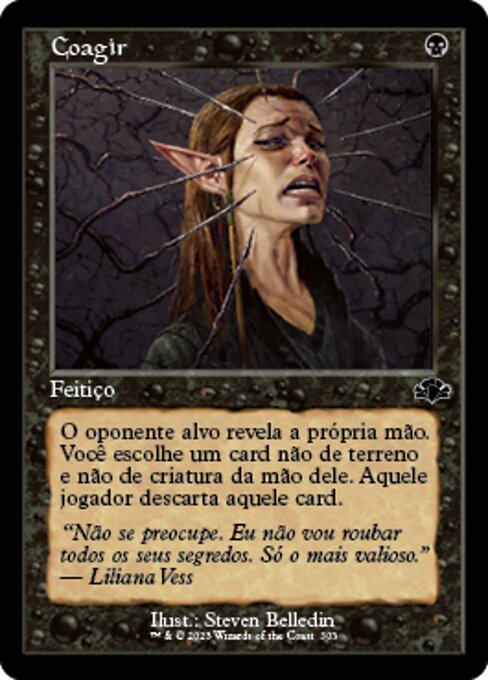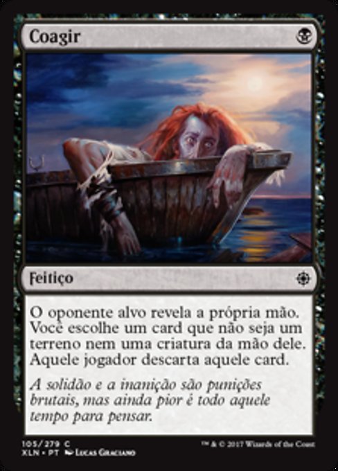|  Variations— Parts— | CoergirO oponente alvo revela sua própria mão. Você escolhe um card que não seja uma criatura nem um terreno da mão dele. Aquele jogador descarta aquele card.