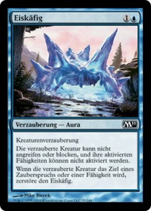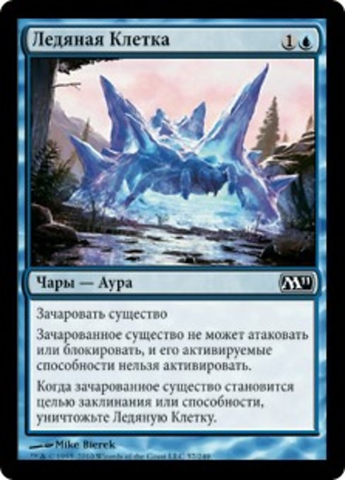 |  Variations— Parts— | 寒冰檻結附於生物 所結附的生物不能進行攻擊或阻擋,其起動式異能也不能起動。 當所結附的生物成為咒語或異能的目標時,消滅寒冰檻。
