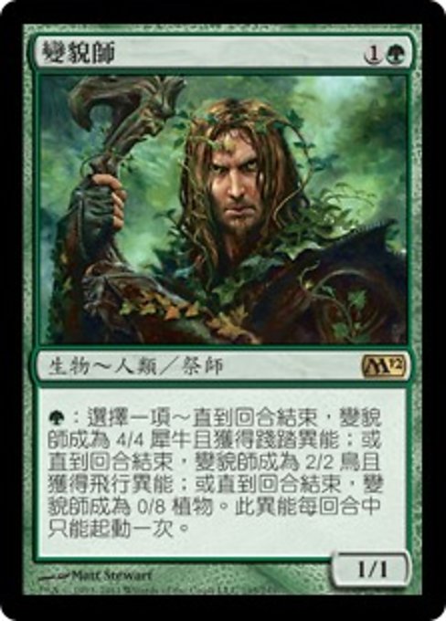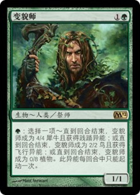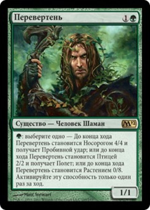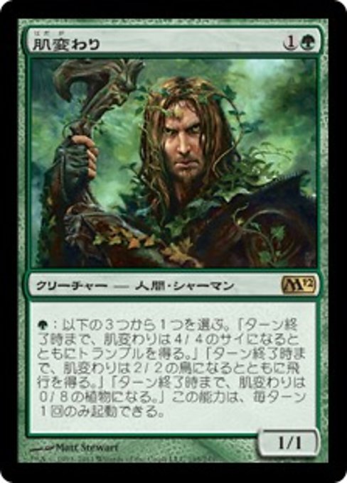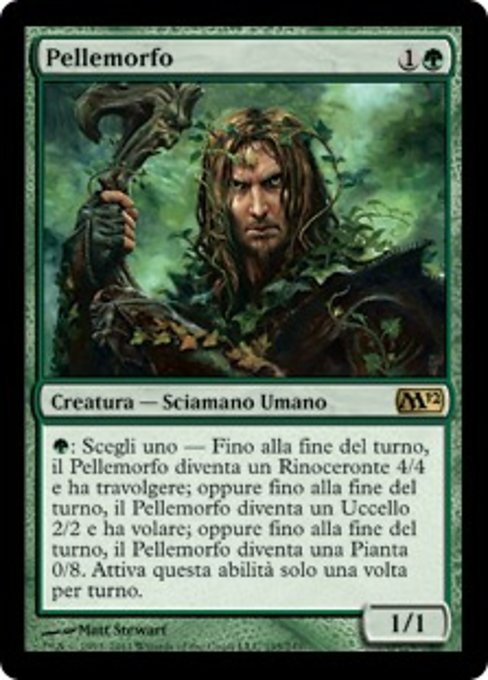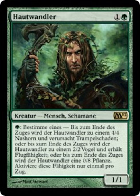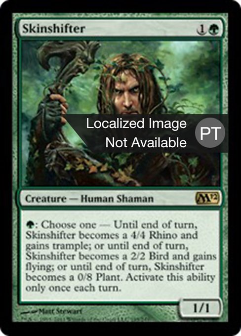 |  Variations— Parts— | Skinshifter1 / 1 • Until end of turn, this creature becomes a Rhino with base power and toughness 4/4 and gains trample. • Until end of turn, this creature becomes a Bird with base power and toughness 2/2 and gains flying. • Until end of turn, this creature becomes a Plant with base power and toughness 0/8.
