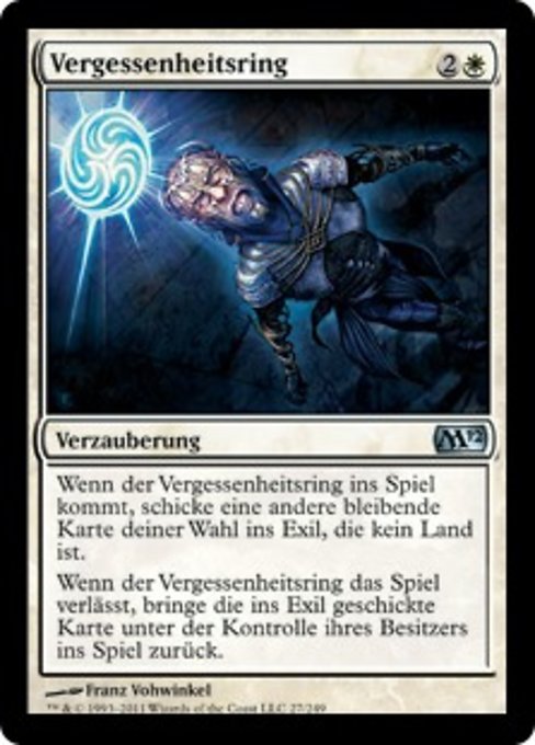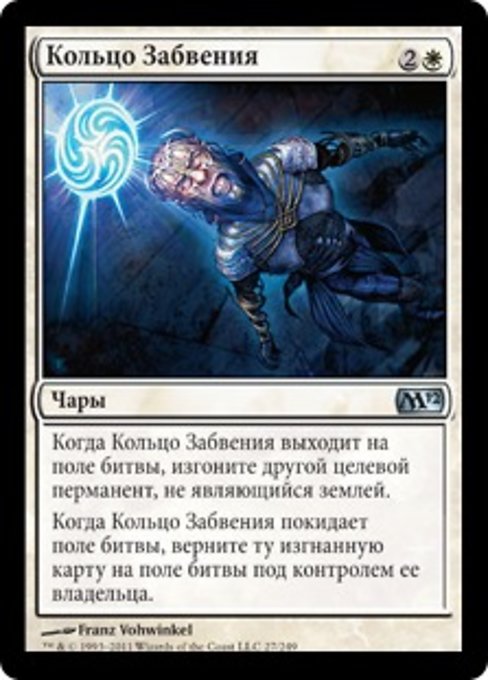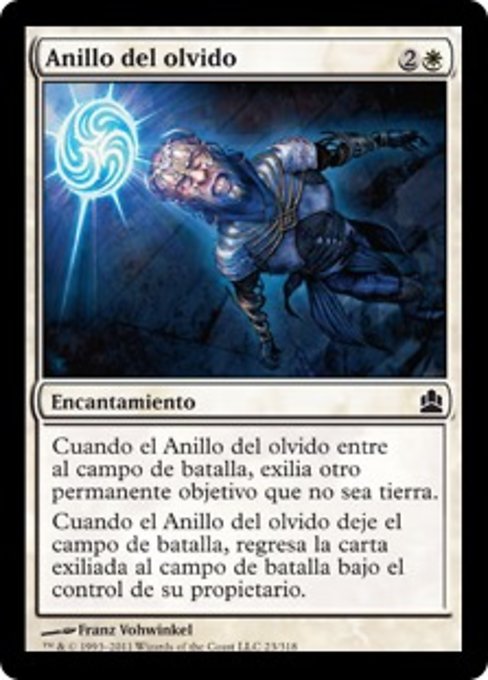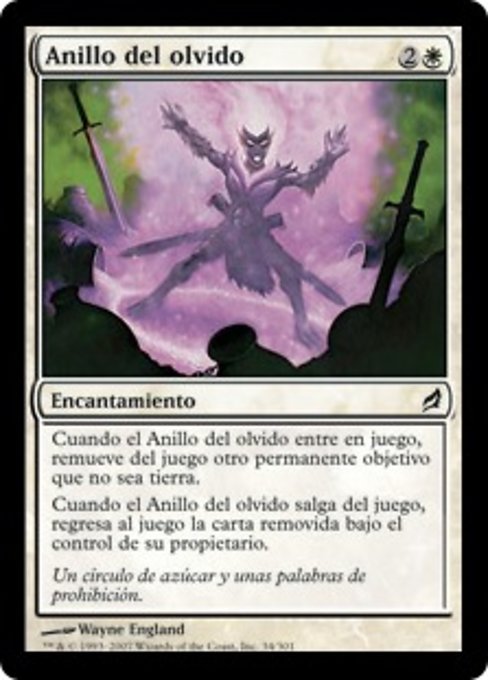 ![]() Variations— Parts— | Anillo del olvidoCuando el Anillo del olvido entre al campo de batalla, exilia otro permanente objetivo que no sea tierra. Cuando el Anillo del olvido deje el campo de batalla, regresa la carta exiliada al campo de batalla bajo el control de su propietario.