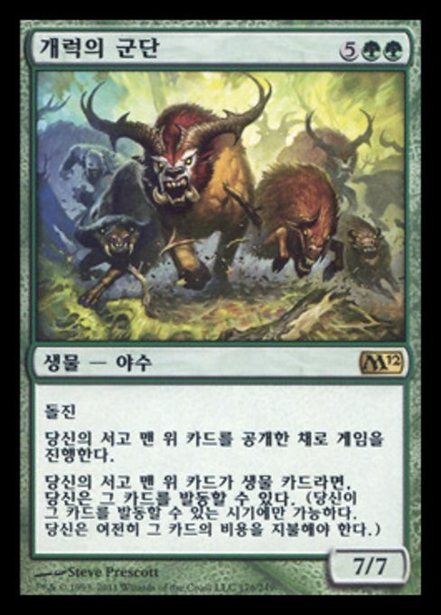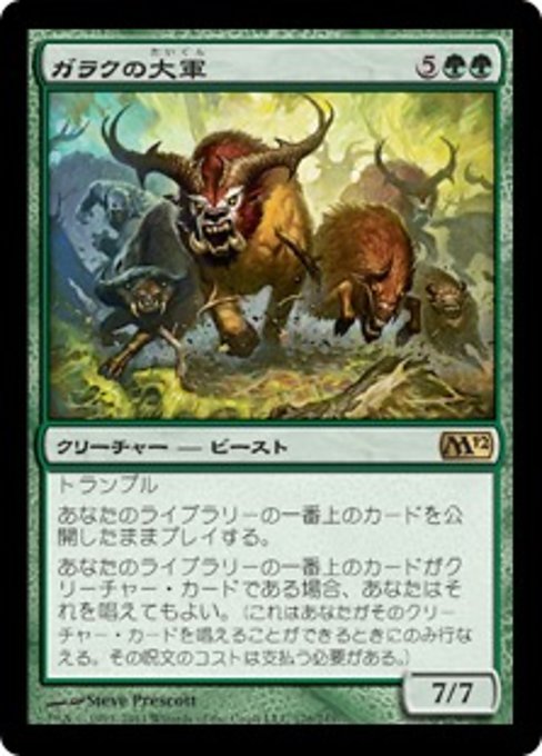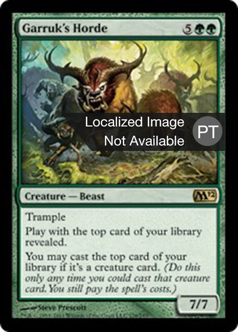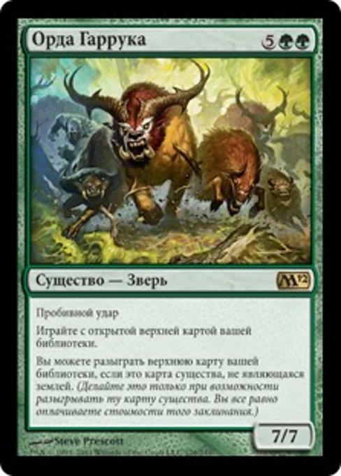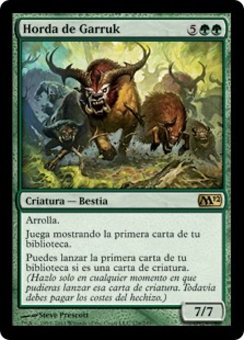 ![]() Variations— Parts— | Horde de Garruk7 / 7 Piétinement Jouez avec la carte du dessus de votre bibliothèque révélée. Vous pouvez lancer la carte du dessus de votre bibliothèque si c'est une carte de créature. (Ne le faites qu'à tout moment où vous pourriez lancer cette carte de créature. Vous payez toujours les coûts du sort.)