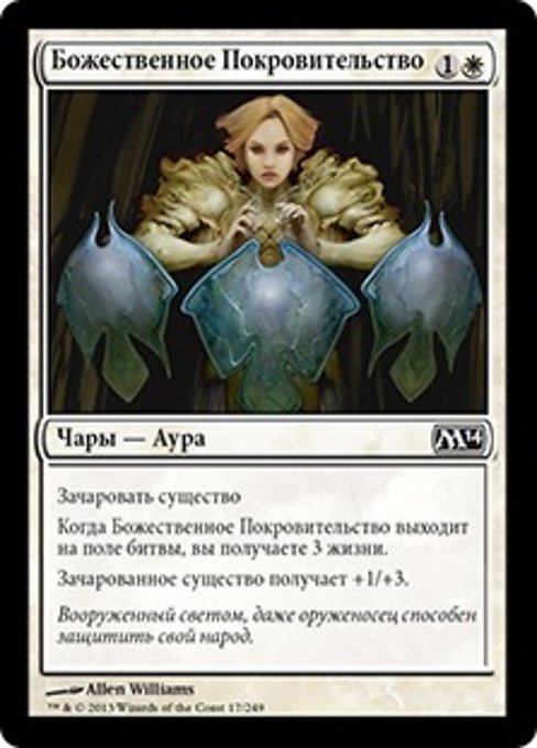 |  Variations— Parts— | Божественное ПокровительствоЗачаровать существо Когда Божественное Покровительство выходит на поле битвы, вы получаете 3 жизни. Зачарованное существо получает +1/+3.