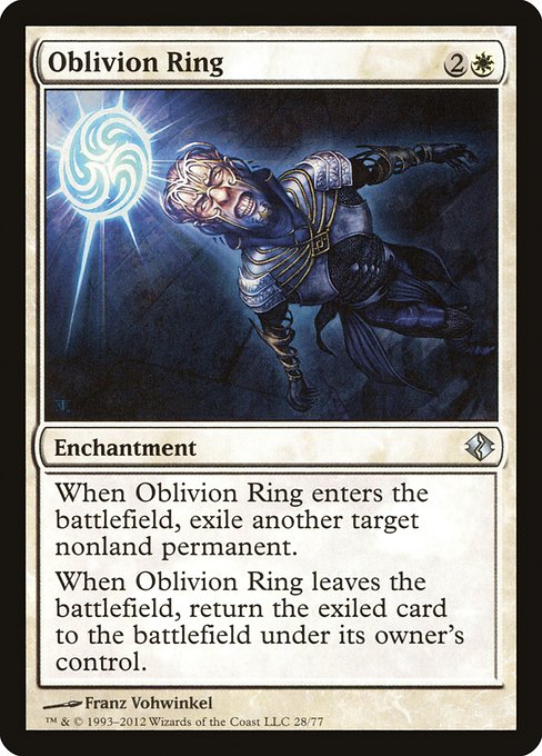 ![]() Variations— Parts— | Oblivion RingWhen this enchantment enters, exile another target nonland permanent. When this enchantment leaves the battlefield, return the exiled card to the battlefield under its owner's control.