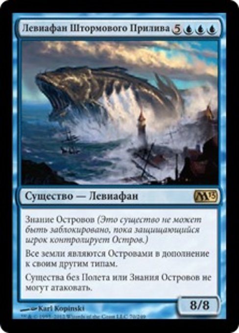 |  Variations— Parts— | Левиафан Штормового Прилива8 / 8 Знание Островов (Это существо не может быть заблокировано, пока защищающийся игрок контролирует Остров.) Все земли являются Островами в дополнение к своим другим типам. Существа без Полета или Знания Островов не могут атаковать.