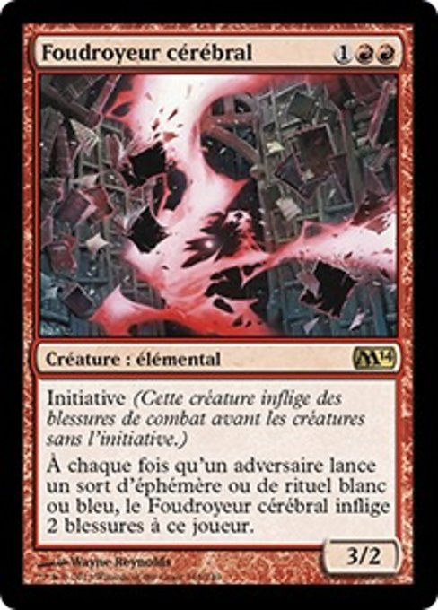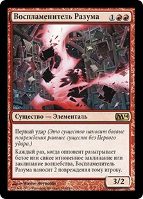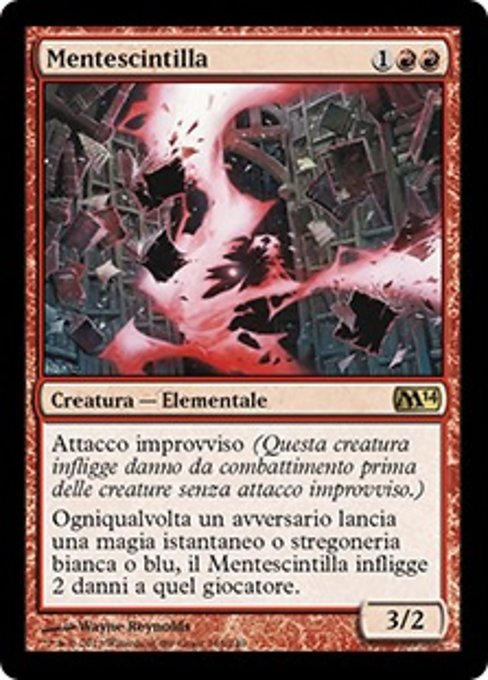 ![]() Variations— Parts— | Mindsparker3 / 2 First strike (This creature deals combat damage before creatures without first strike.) Whenever an opponent casts a white or blue instant or sorcery spell, this creature deals 2 damage to that player.