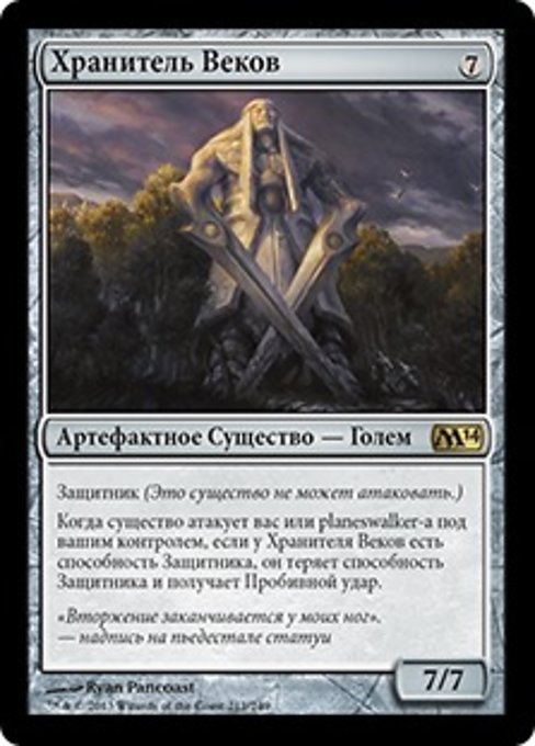 |  Variations— Parts— | Guardian of the Ages7 / 7 Defender (This creature can't attack.) When a creature attacks you or a planeswalker you control, if this creature has defender, it loses defender and gains trample.