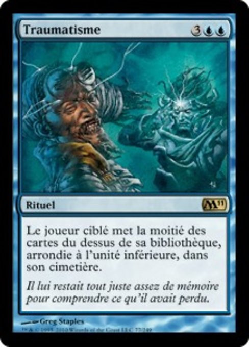 |  Variations— Parts— | TraumatismeLe joueur ciblé met la moitié des cartes du dessus de sa bibliothèque, arrondie à l'unité inférieure, dans son cimetière.