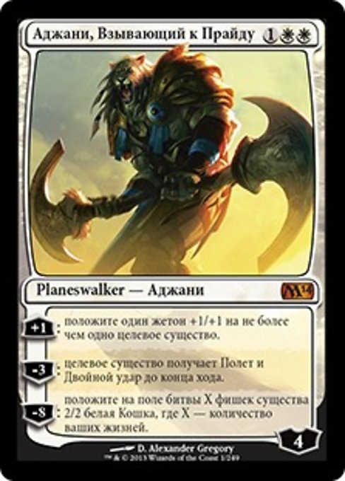 |  Variations— Parts— | Ajani, Evocatore del Branco+1 : Scegli fino a una creatura bersaglio. Metti un segnalino +1/+1 su di essa.-3 +1 su di essa.-3+1 su di essa.-3 Una creatura bersaglio ha volare e doppio attacco fino alla fine del turno.-8 : Metti sul campo di battaglia X pedine creatura Felino 2/2 bianche, dove X sono i tuoi punti vita.