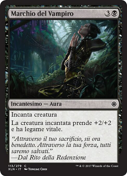 |  Variations— Parts— | Marchio del VampiroIncanta creaturaLa creatura incantata prende +2/+2 e ha legame vitale. (Il danno inflitto dalla creatura fa anche guadagnare al suo controllore altrettanti punti vita.)