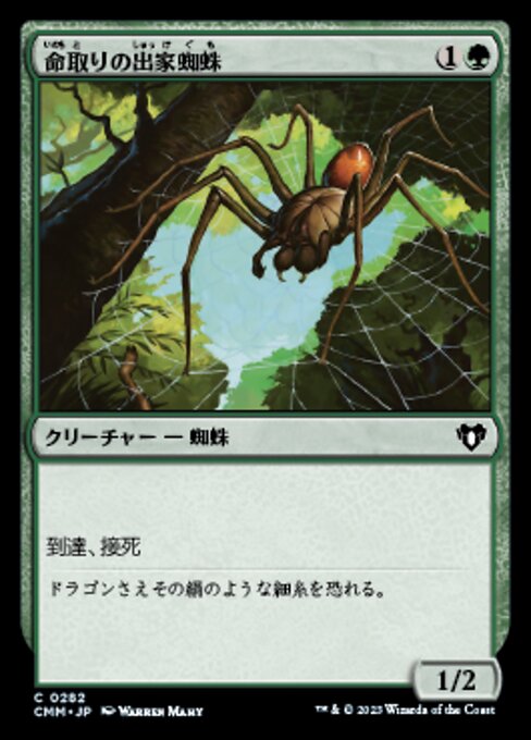 |  Variations— Parts— | 命取りの出家蜘蛛1 / 2 到達(このクリーチャーでは飛行を持つクリーチャーをブロックできる。)接死(これが何らかのダメージをクリーチャーに与えた場合、それだけで破壊される。)