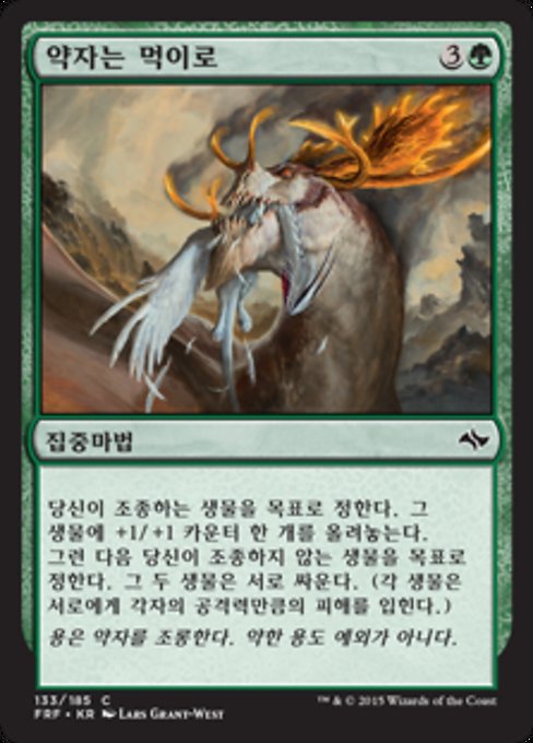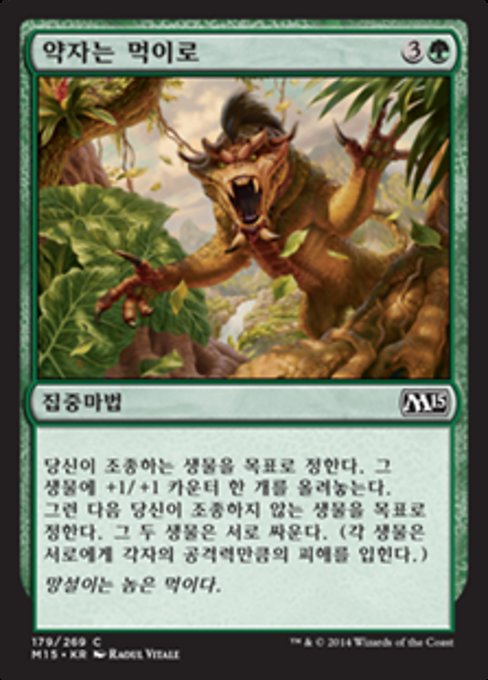 |  Variations— Parts— | 약자는 먹이로당신이 조종하는 생물 한 개를 목표로 정한다. 그 생물에 +1/+1 카운터 한 개를 올려놓는다. 그런 다음 당신이 조종하지 않는 생물 한 개를 목표로 정한다. 그 생물과 +1/+1 카운터를 올린 생물이 서로 싸운다. (각 생물은 서로에게 각자의 공격력만큼의 피해를 입힌다.)
