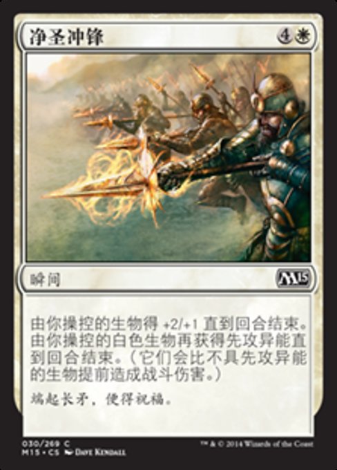 ![]() Variations— Parts— | Sanctified ChargeCreatures you control get +2/+1 until end of turn. White creatures you control also gain first strike until end of turn. (They deal combat damage before creatures without first strike.)