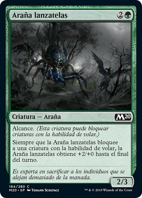 ![]() Variations— Parts— | Araña lanzatelas2 / 3 Alcance. (Esta criatura puede bloquear a criaturas con la habilidad de volar.) Siempre que la Araña lanzatelas bloquee a una criatura con la habilidad de volar, la Araña lanzatelas obtiene +2/+0 hasta el final del turno.