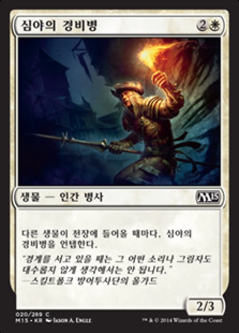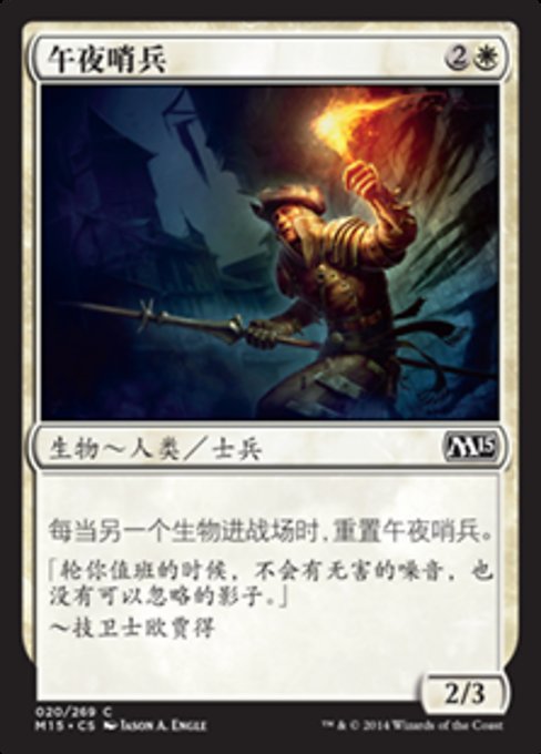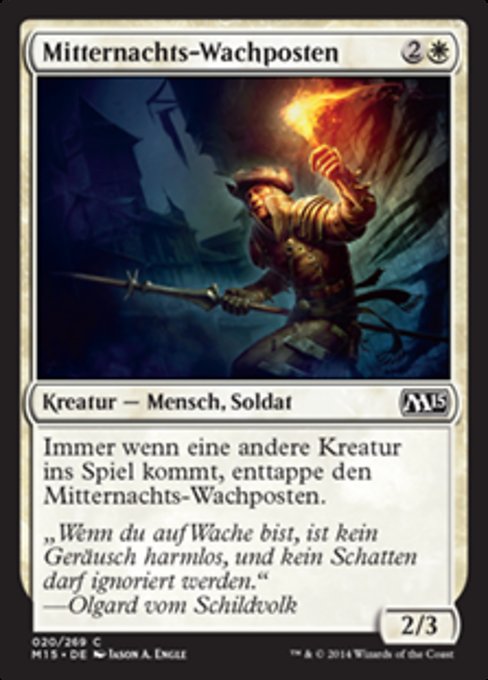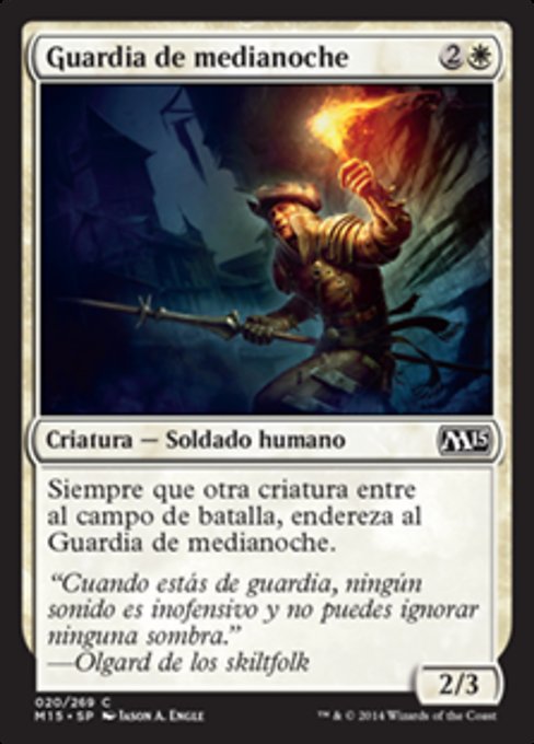 |  Variations— Parts— | Garde de minuit2 / 3 À chaque fois qu'une autre créature arrive sur le champ de bataille, dégagez la Garde de minuit.