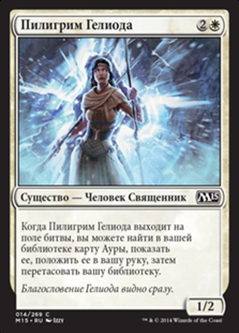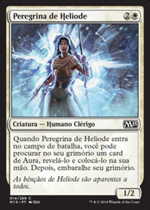 |  Variations— Parts— | Pellegrina di Eliod1 / 2 Quando la Pellegrina di Eliod entra nel campo di battaglia, puoi passare in rassegna il tuo grimorio per una carta Aura, rivelarla, aggiungerla alla tua mano, poi rimescolare il tuo grimorio.