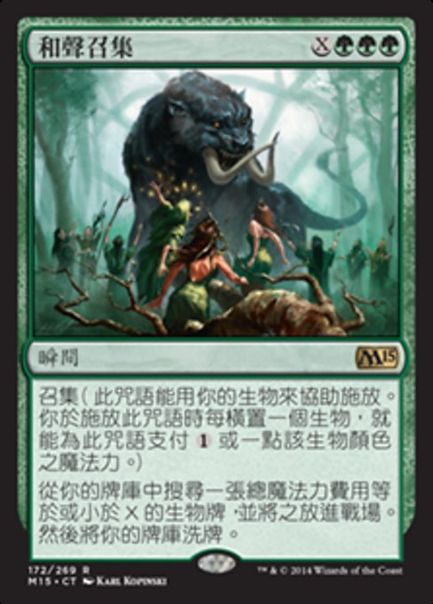 ![]() Variations— Parts— | Corda della ConvocazioneConvocazione (Le tue creature possono aiutarti a lanciare questa magia. Ogni creatura che TAPpi mentre lanci questa magia corrisponde al pagamento di Passa in rassegna il tuo grimorio per una carta creatura con costo di mana convertito pari o inferiore a X e mettila sul campo di battaglia. Poi rimescola il tuo grimorio.