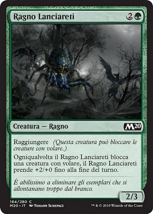 ![]() Variations— Parts— | Ragno Lanciareti2 / 3 Raggiungere (Questa creatura può bloccare le creature con volare.) Ogniqualvolta il Ragno Lanciareti blocca una creatura con volare, il Ragno Lanciareti prende +2/+0 fino alla fine del turno.