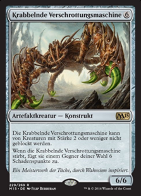 ![]() Variations— Parts— | Macchina Devastatrice Sferragliante6 / 6 La Macchina Devastatrice Sferragliante non può essere bloccata da creature con forza pari o inferiore a 2. Quando la Macchina Devastatrice Sferragliante muore, infligge 6 danni a un avversario bersaglio.