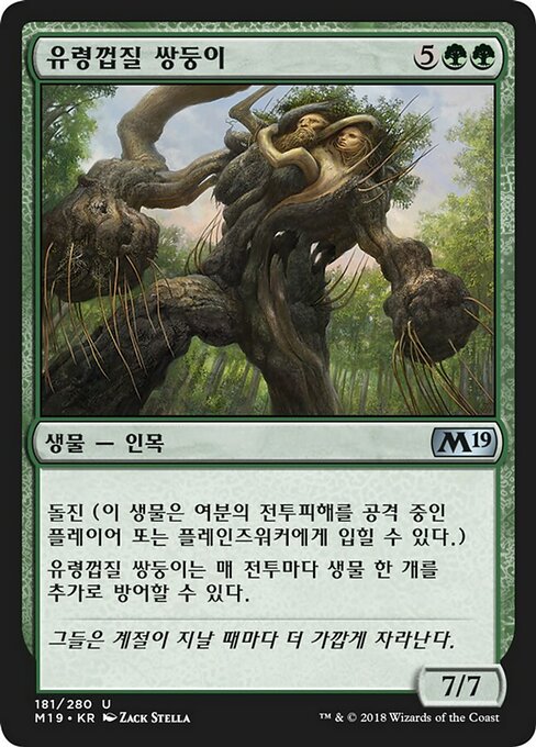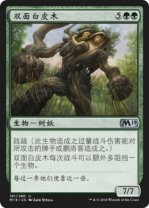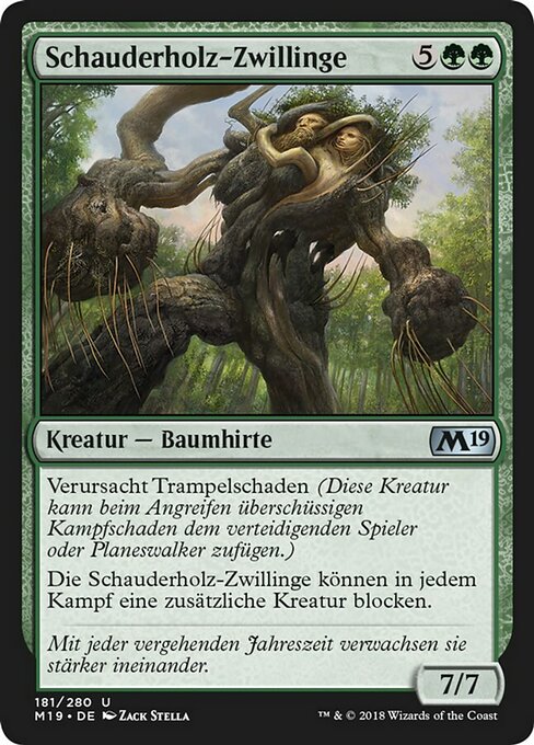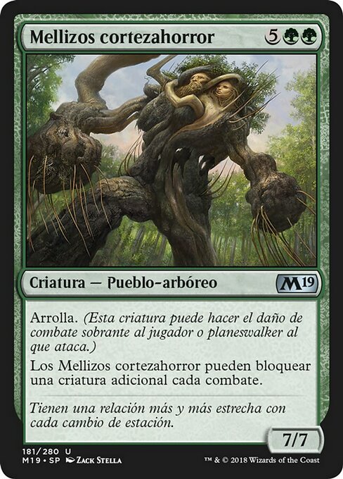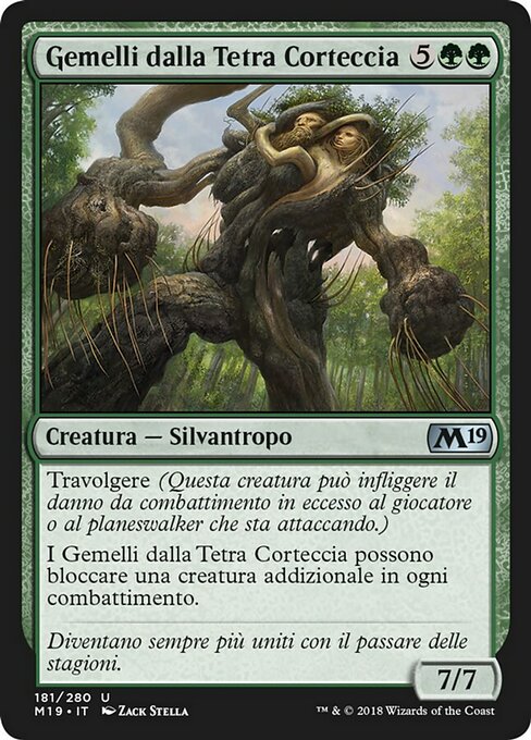 ![]() Variations— Parts— | Ghastbark Twins7 / 7 Trample (This creature can deal excess combat damage to the player or planeswalker it's attacking.) This creature can block an additional creature each combat.