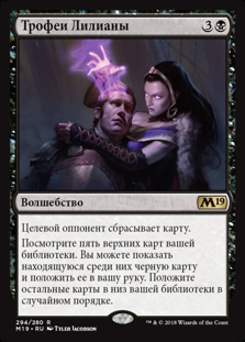 |  Variations— Parts— | Liliana's SpoilsTarget opponent discards a card. Look at the top five cards of your library. You may reveal a black card from among them and put it into your hand. Put the rest on the bottom of your library in a random order.