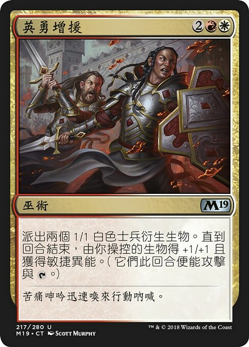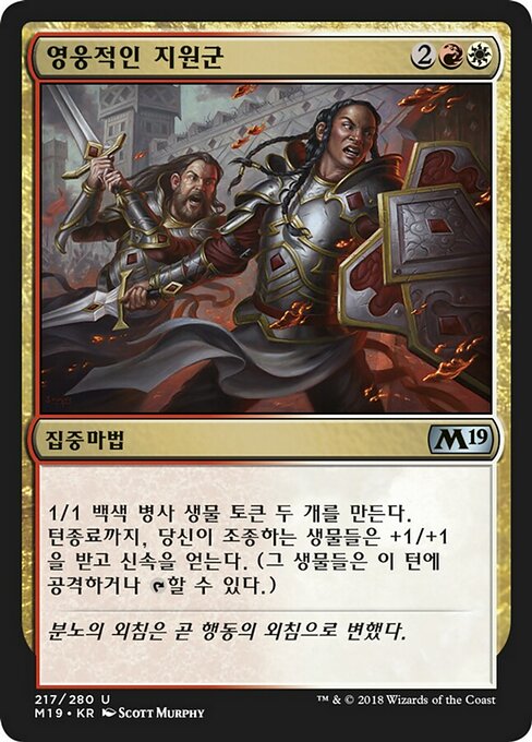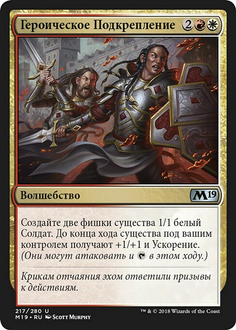 ![]() Variations— Parts— | Refuerzos heroicosCrea dos fichas de criatura Soldado blancas 1/1. Hasta el final del turno, las criaturas que controlas obtienen +1/+1 y ganan la habilidad de prisa. (Pueden atacar y