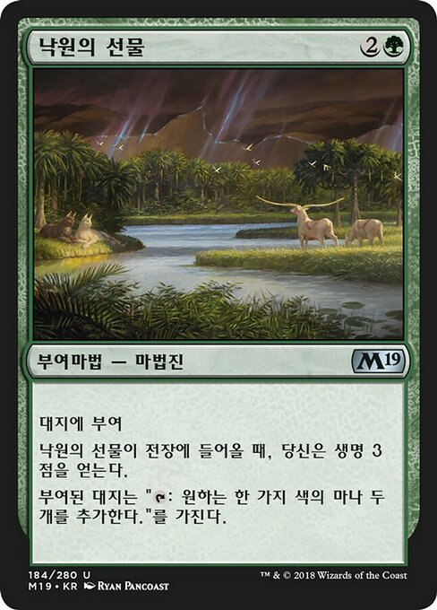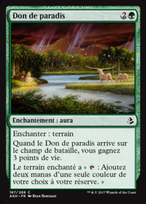 ![]() Variations— Parts— | Don de paradisEnchanter : terrain Quand le Don de paradis arrive sur le champ de bataille, vous gagnez 3 points de vie. Le terrain enchanté a «