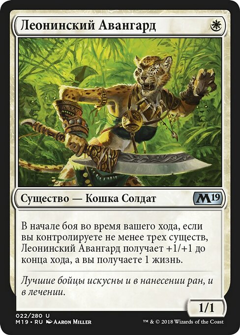 |  Variations— Parts— | Avant-garde léonine1 / 1 Au début du combat pendant votre tour, si vous contrôlez au moins trois créatures, l'Avant-garde léonine gagne +1/+1 jusqu'à la fin du tour et vous gagnez 1 point de vie.