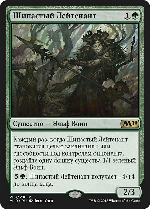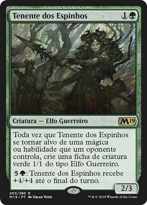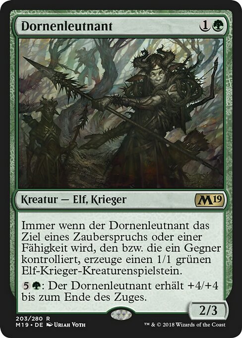 ![]() Variations— Parts— | Tenente dei Rovi2 / 3 Ogniqualvolta il Tenente dei Rovi diventa bersaglio di una magia o abilità controllata da un avversario, crea una pedina creatura Guerriero Elfo 1/1 verde.