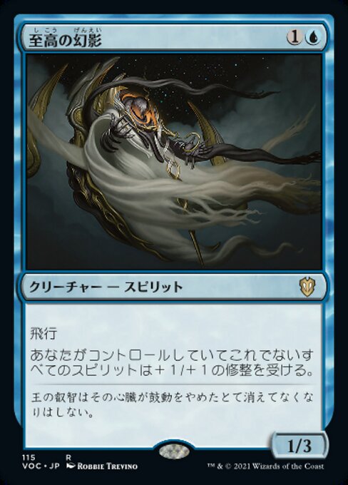 |  Variations— Parts— | 至高の幻影1 / 3 飛行 あなたがコントロールしている他のスピリットは+1/+1の修整を受ける。