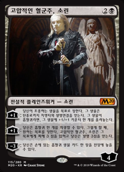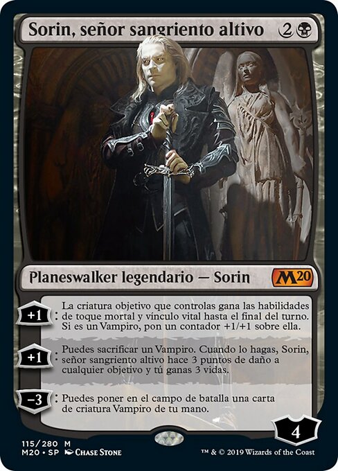 ![]() Variations— Parts : 1 | Sorin, Imperious Bloodlord+1 : Target creature you control gains deathtouch and lifelink until end of turn. If it's a Vampire, put a +1/+1 counter on it. +1 : You may sacrifice a Vampire. When you do, Sorin deals 3 damage to any target and you gain 3 life. −3 : You may put a Vampire creature card from your hand onto the battlefield.