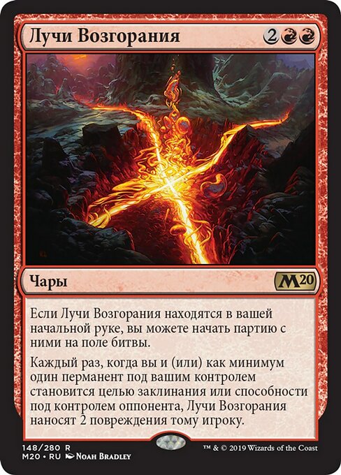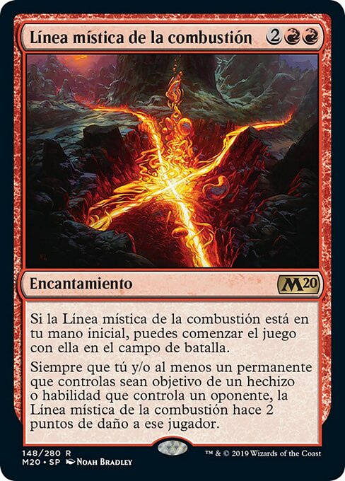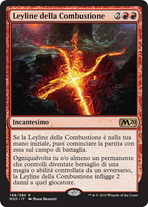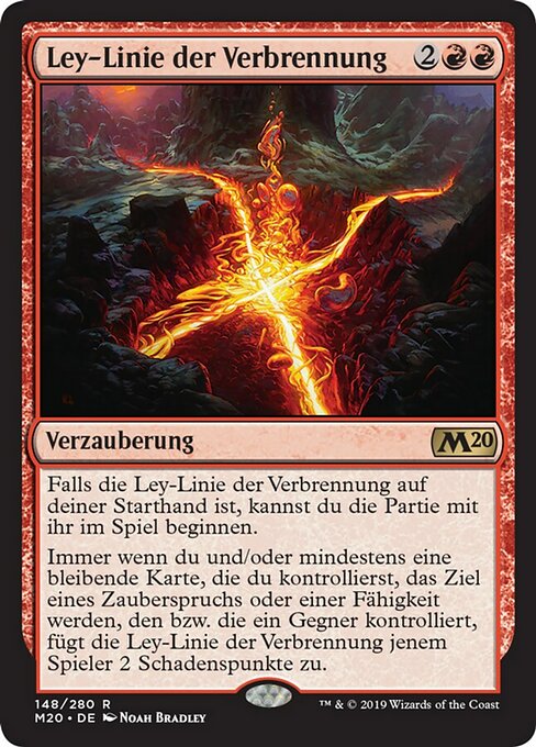 ![]() Variations— Parts— | Leyline of CombustionIf this card is in your opening hand, you may begin the game with it on the battlefield. Whenever you and/or at least one permanent you control becomes the target of a spell or ability an opponent controls, this enchantment deals 2 damage to that player.