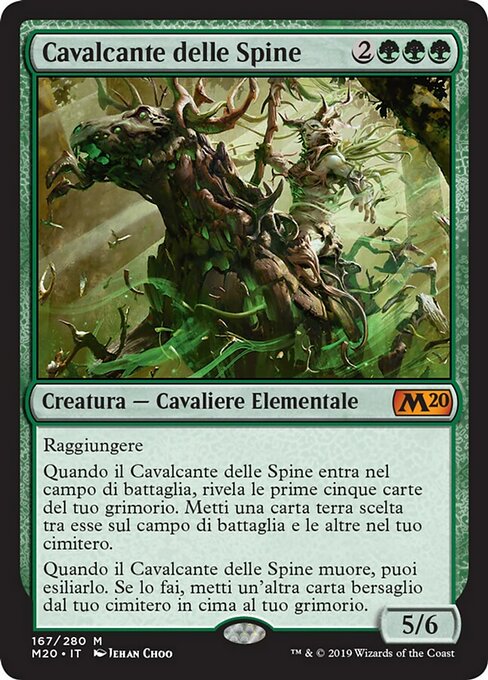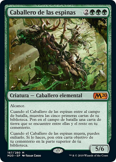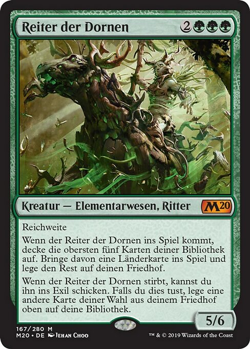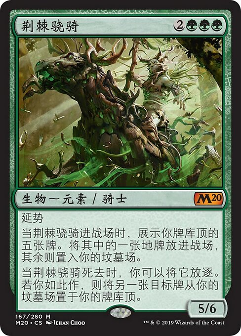 ![]() Variations— Parts— | Cavalier of Thorns5 / 6 Reach When this creature enters, reveal the top five cards of your library. Put a land card from among them onto the battlefield and the rest into your graveyard. When this creature dies, you may exile it. If you do, put another target card from your graveyard on top of your library.