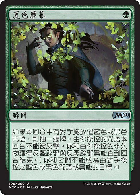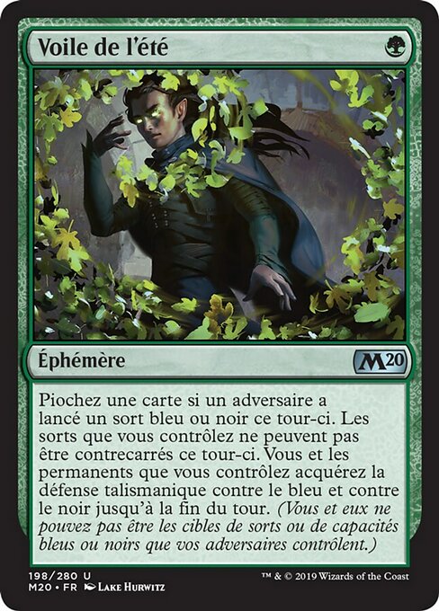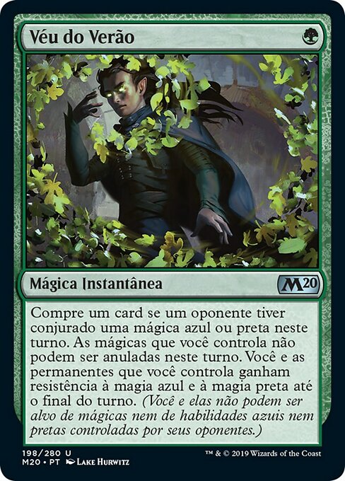 ![]() Variations— Parts— | Veil of SummerDraw a card if an opponent has cast a blue or black spell this turn. Spells you control can't be countered this turn. You and permanents you control gain hexproof from blue and from black until end of turn. (You and they can't be the targets of blue or black spells or abilities your opponents control.)