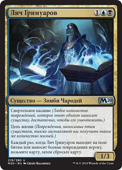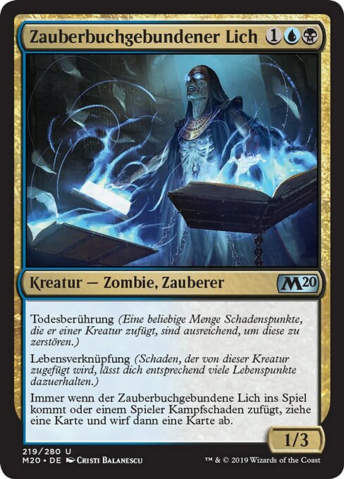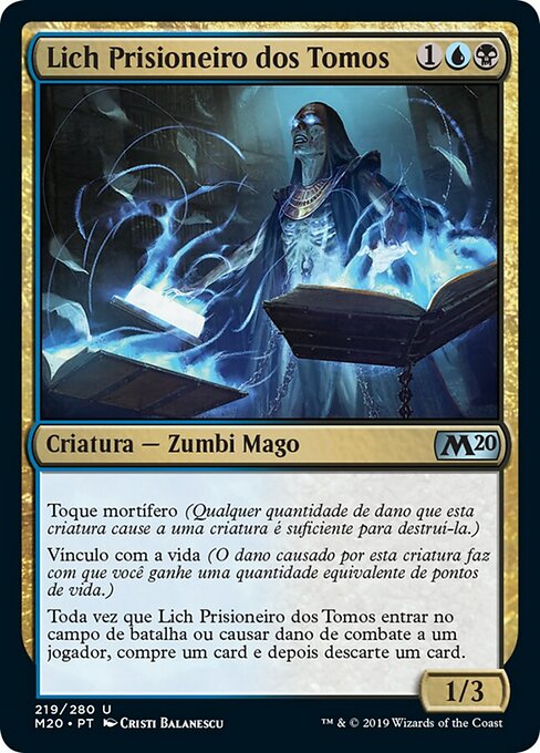|  Variations— Parts— | Tomebound Lich1 / 3 Deathtouch (Any amount of damage this deals to a creature is enough to destroy it.) Lifelink (Damage dealt by this creature also causes you to gain that much life.) Whenever this creature enters or deals combat damage to a player, draw a card, then discard a card.
